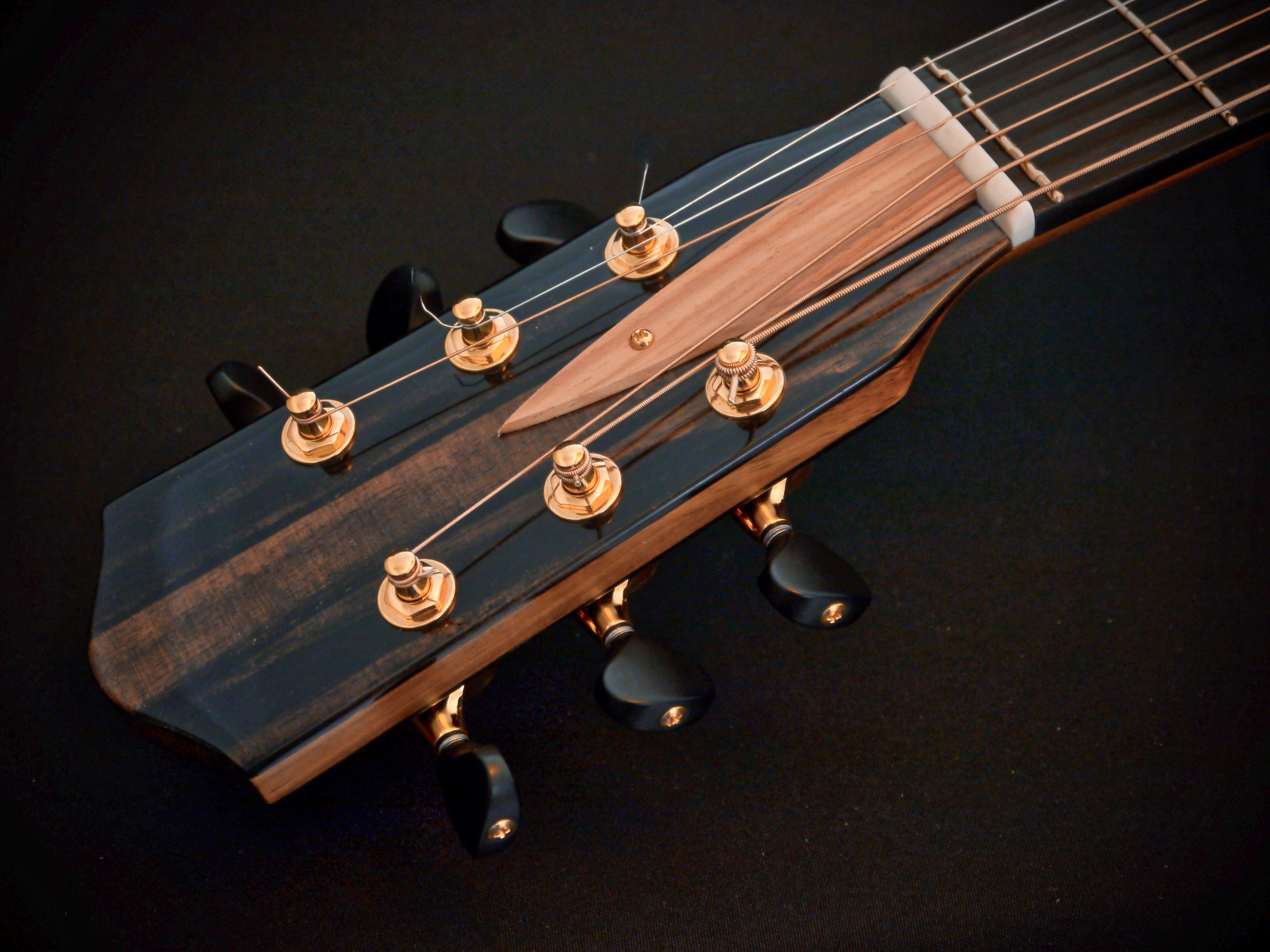 I use ebony for fretboards. This wonderful timber exudes quality and class. It features on most of my instruments. But there are other options – Royal blackwood – which is the commercial name for torrefied purpleheart – another serious option – black, stiff, stable and beautiful to look at. Though I now offer two upgrades – a super hard, dense and beautiful Australian wood called Ringed gidgee, and I also have a stash of stunning old Mun ebony from south east Asia. The most beautiful and one of the most stable of ebonies.